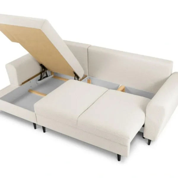 اللون البيج المائل إلى الأبيض يضيف إحساسًا بالهدوء والاتساع، كما يسهل تنسيقه مع مختلف ألوان الديكور، سواء الفاتحة أو الدافئة. وتتميّز الكنبة بكونها كنبة ركنة قابلة للتمدد، حيث يمكن تحويلها بسهولة إلى مساحة إضافية للاسترخاء أو النوم عند الحاجة، ما يجعلها خيارًا عمليًا للاستخدام اليومي أو استقبال الضيوف.