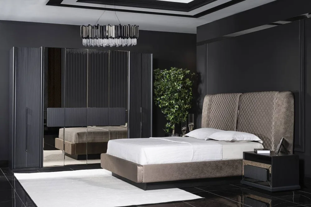 غرفة نوم عرسان فاخرة بتصميم عملي ومساحات تخزين مريحة.