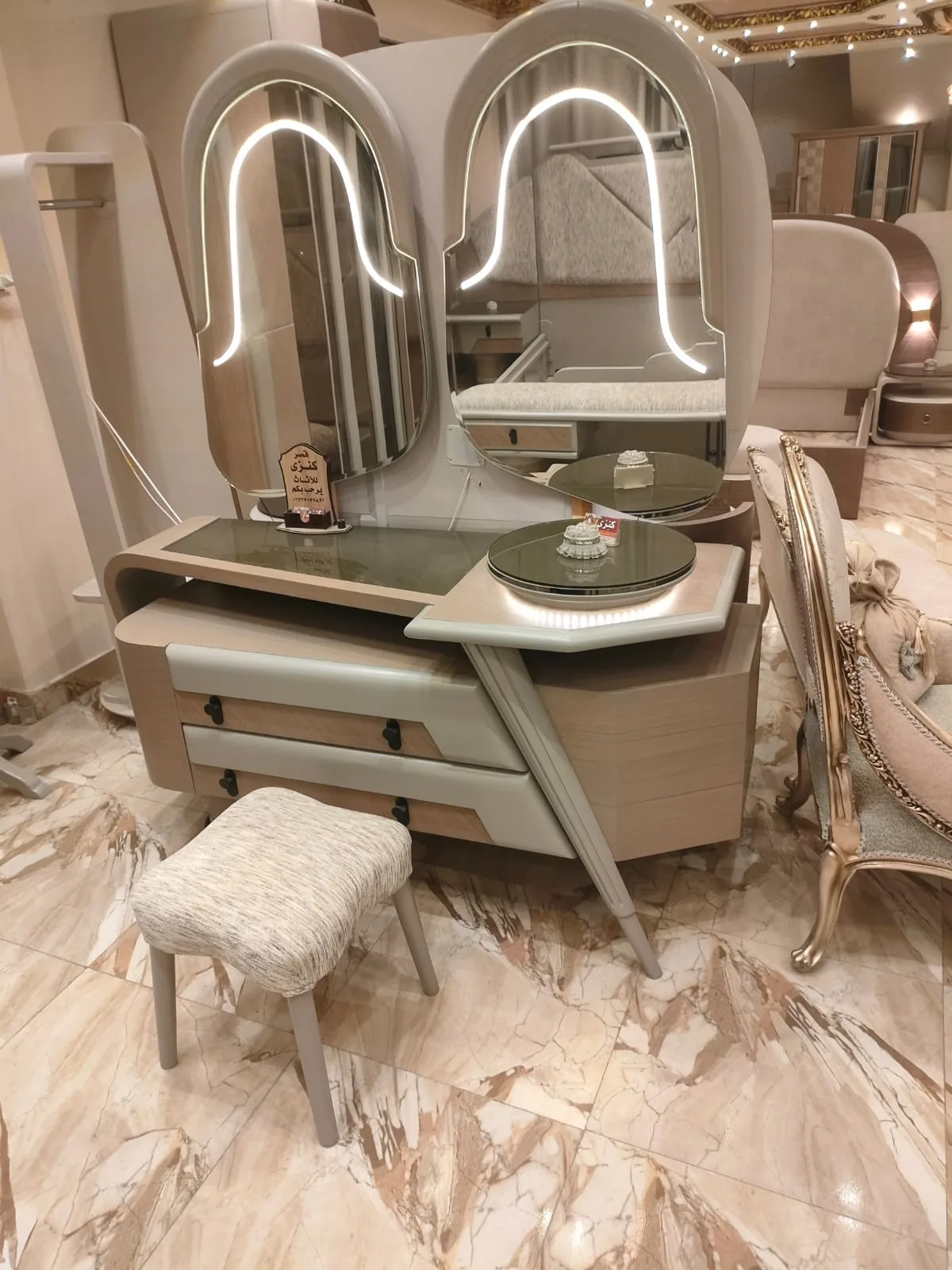 التسريحة بمرآة تأتي بتصميم بسيط وأنيق، مما يجعلها مناسبة للاستخدام اليومي، سواء للعناية الشخصية أو لتنظيم الأدوات. كما أن وجود 2 كومود جانبيين يوفر مساحة إضافية للتخزين، مما يساعد في الحفاظ على ترتيب الغرفة.