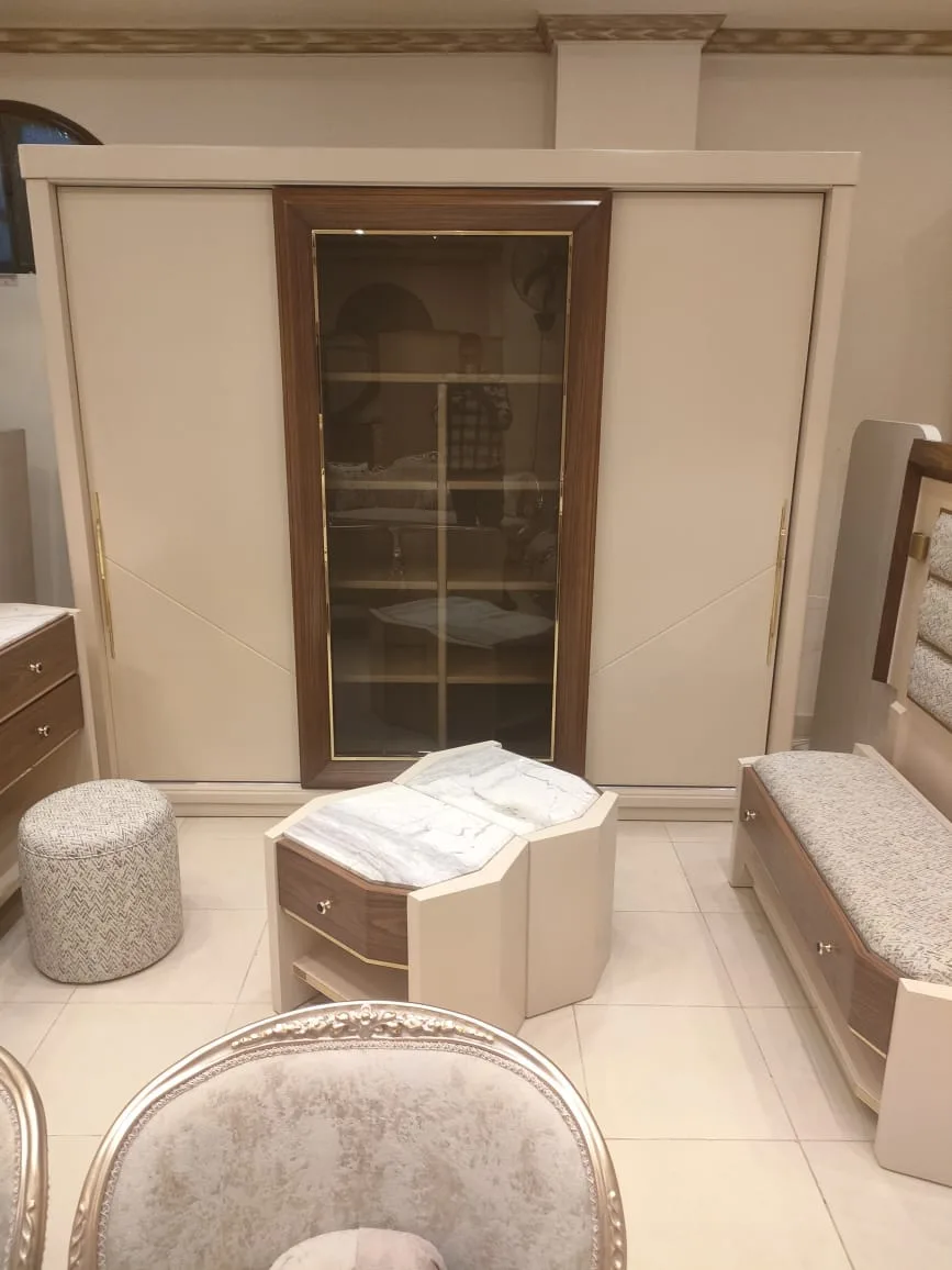 كما تم اختيار الخامات بعناية لتكون عملية وسهلة الاستخدام اليومي، مع الاهتمام بأدق التفاصيل لضمان راحة المستخدم وسهولة الحركة داخل الغرفة.