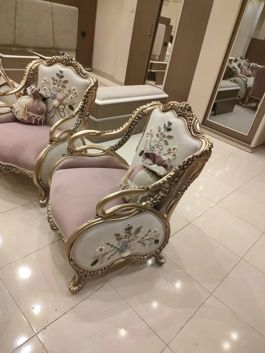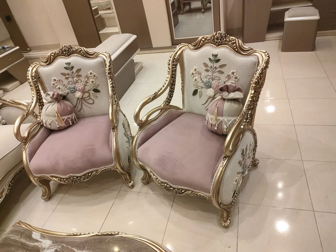 تم تغطية الصالون بأقمشة قطيفة فاخرة تمنح ملمسًا ناعمًا ومظهرًا غنيًا، مع لون ذهبي جذاب يعكس الفخامة ويُضفي إشراقة على المكان. كما تم الاهتمام بأدق التفاصيل في التشطيبات، بدءًا من النقوش اليدوية الراقية وحتى الدهانات المذهبة عالية الجودة التي تضيف لمسة ملكية مميزة.