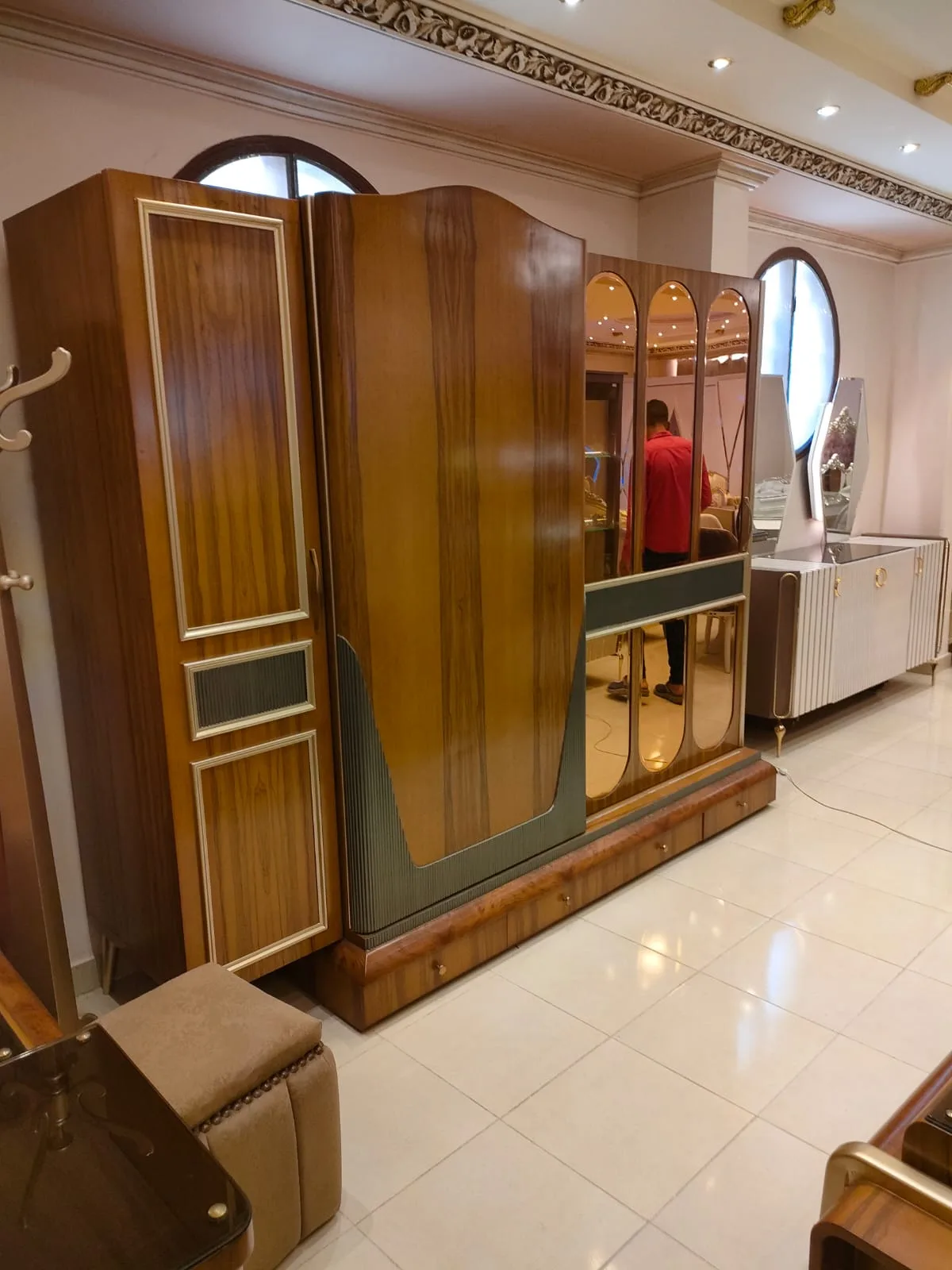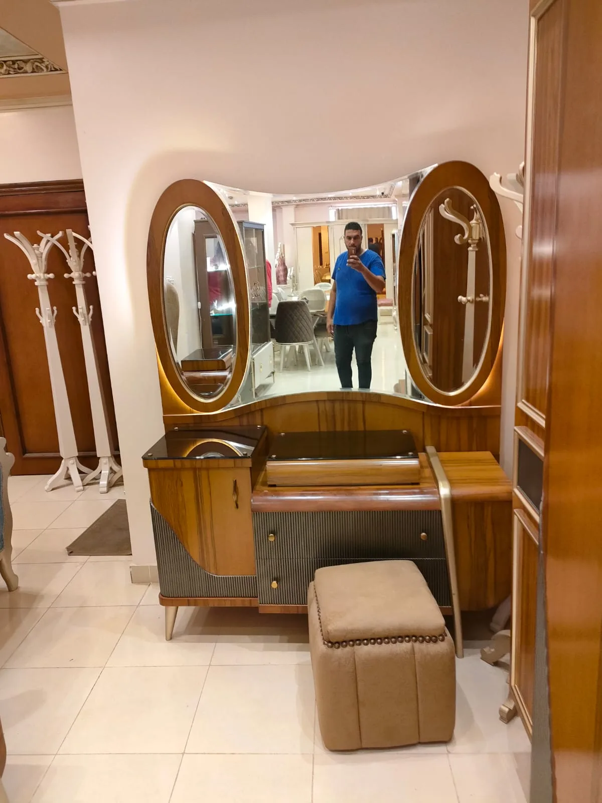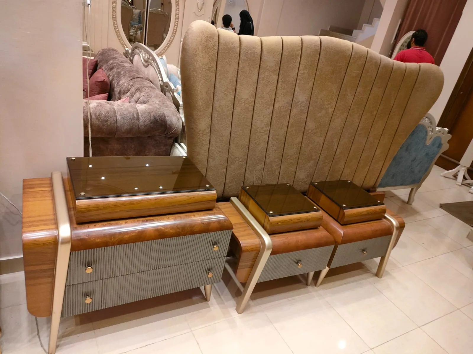 - المكونات: سرير + دولاب جرار + تسريحة + 2 كومود + بف + وحدة إضافية