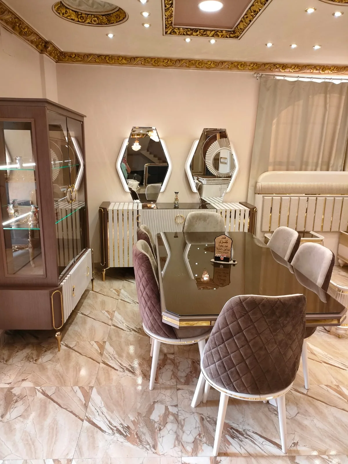 اللون البني الأنيق مع لمسة قماش القطيفة يمنح الغرفة مظهرًا دافئًا وفخمًا، مما يجعلها مثالية للاستخدام اليومي أو المناسبات الخاصة. كما أن ترابيزة سفرة مستطيلة بمقاس 200 سم توفر مساحة كافية لاستيعاب أفراد العائلة والضيوف بكل راحة.