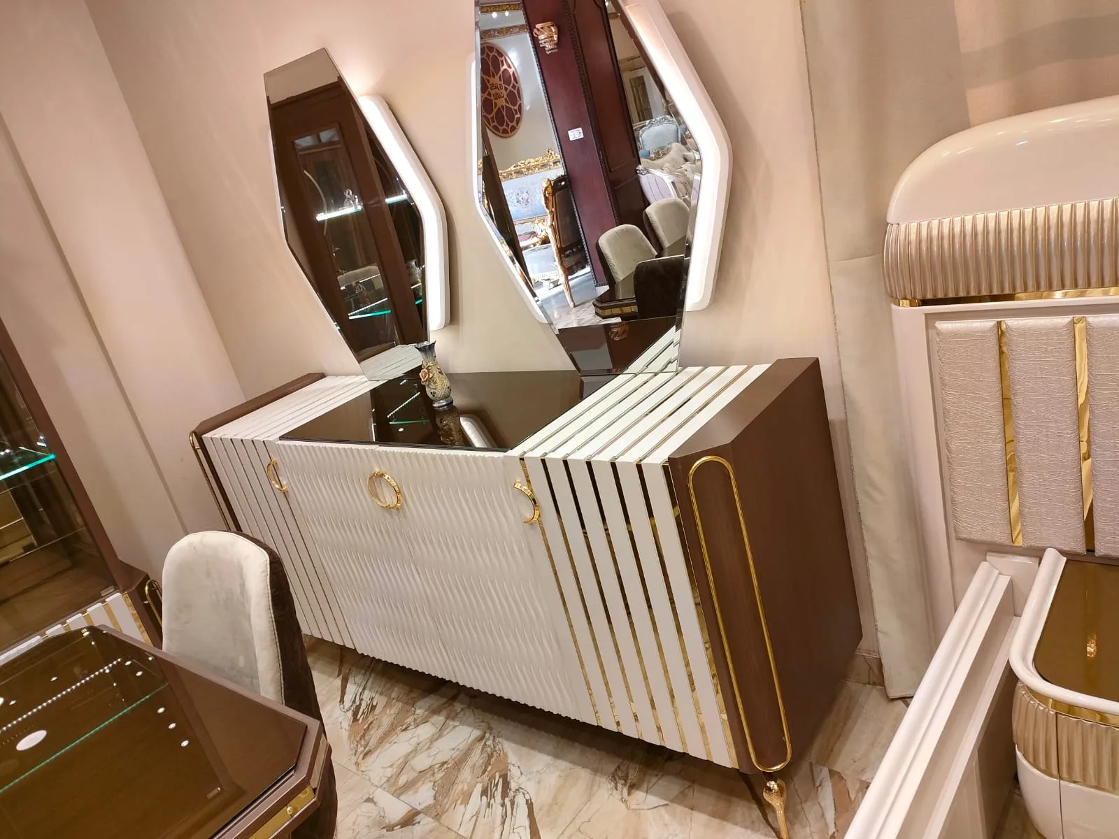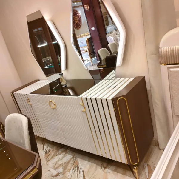 تم تصميم كل عنصر داخل غرفة السفرة ليكمل الآخر، بداية من الترابيزة وصولًا إلى البوفيه والنيش، مما يجعلها غرفة سفرة كاملة مودرن تجمع بين الشكل الجمالي والوظيفة العملية.