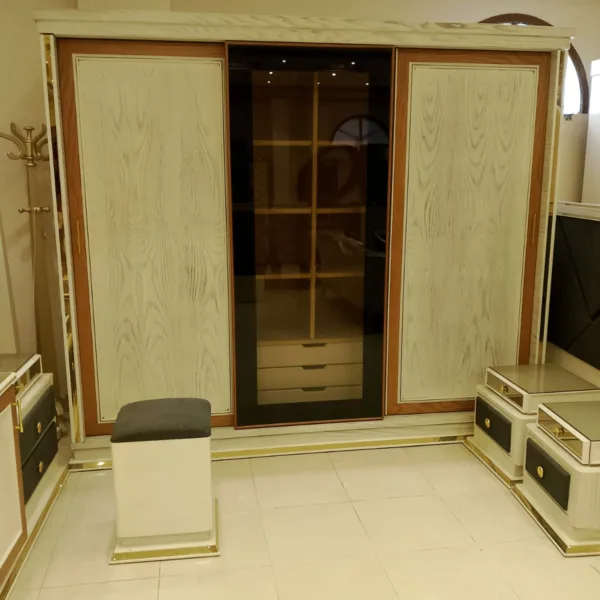 - المكونات: سرير + دولاب جرار + 2 كومود + تسريحة بمرآة دائرية