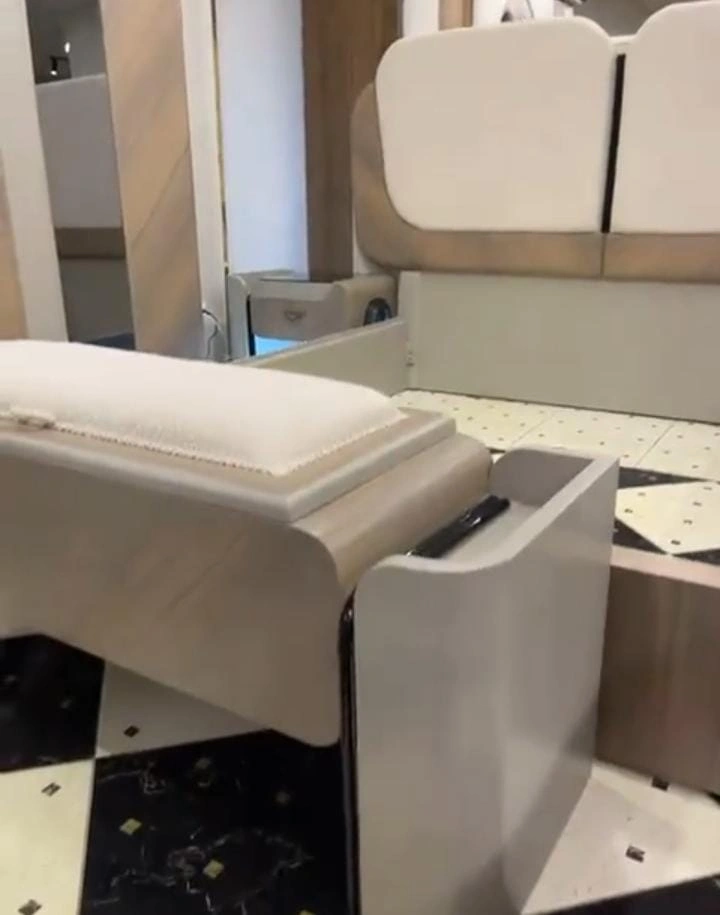 سرير فاخر بتصميم مريح وعصري، مرفق بـ بنكت عملي أسفل السرير.