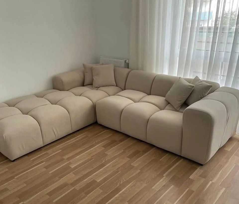 تأتي الركنة بمقاس 3×2 متر على شكل حرف L، وهو تصميم عملي وموفر للمساحة، مثالي لغرف المعيشة متوسطة أو كبيرة الحجم.